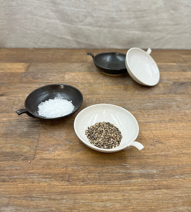 A pair of small dishes with a little handle, one glazed in glossy rich black and one in white. Useful for dipping oil, or soy sauce as well as salt and pepper. Sold as a pair.