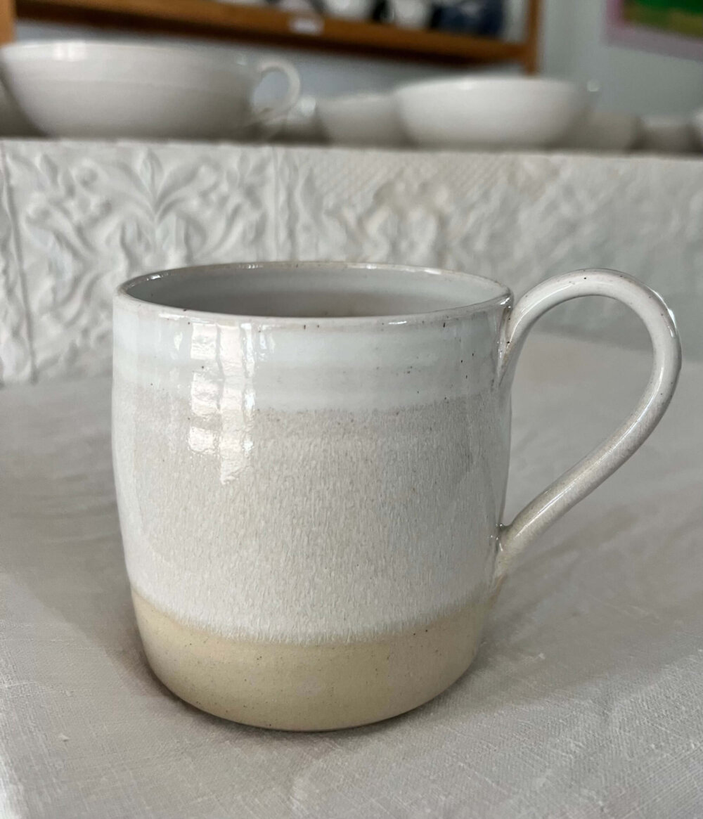 Straight mug with natural and white overlapping glaze. 400ml capacity 9 x 9 cm